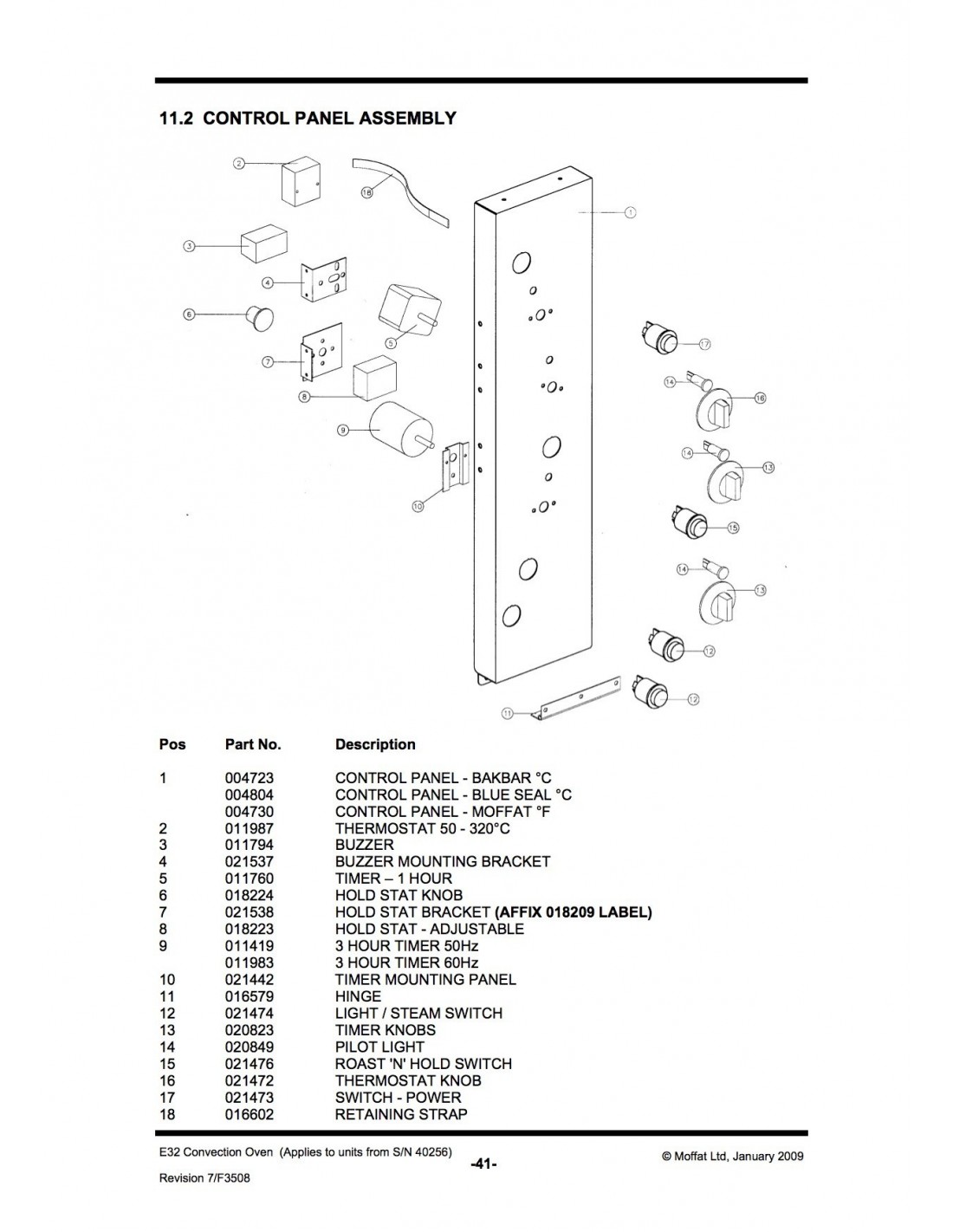 Pos Part No. Description 1 016241 VENT HOOD PLATE 2 016245 HOOD SPACER 3 021448 WRAPPER 4 017872 INSPECTION PANEL 5 021549 TOP INSULATION PANEL 6 014954 VENT TUBE 7 090424 FIBREGLASS - 38mm 8 013986 REAR VERTICAL 9 013978 LH INSULATION PLATE 10 004727 OVEN - ENAMELLED 11 013951 HINGE PLATE BOTTOM 12 013987 INSULATOR OVEN 13 013941 DRAIN TUBE (to 12/98) 14 002247 DRAIN PLUG (to 12/98) 15 015597 FAN 16 013974 PHIAL GUARD 17 015360 ELEMENT ASSEMBLY 220V 015363 ELEMENT ASSEMBLY 240V 18 015581 ELEMENT BRACKET 19 013520 OVEN LIGHT ASSY 003434 SILK GASKET 013521 LAMP - 40W 003002 LIGHT GLASS 20 013967 SIDE INSULATION PANEL 21 013965 MOTOR MOUNTING PLATE 22 013431K MOTOR 23 021172 HEAT BLOCK PLATE 24 021467 CATCH PLATE 25 013893 DOOR SPRING CATCH 26 021173 FRONT VERTICAL 27 021534 RELAY 28 003004 MICROSWITCH 29 013977 INSULATOR 30 015966 CONTACTOR 022993 CONTACTOR MOUNTING BRACKET 022994 CONTACTOR UPGRADE KIT (TO S/N 47670) 31 021636 MICROSWITCH BRACKET 32 013610 DOOR BUSH 33 021637 MICROSWITCH BUTTON 34 014031 OVEN BAFFLE STUD 35 015656 FAN BAFFLE 36 015168 OVEN RACK 37 041405 SCREW 003397 SPACER 38 015575 SIDE RACK LH 39 015930 BAFFLE LOCATING BRACKET 40 021517 HORIZONTAL SEAL ASSEMBLY 021519 HORIZONTAL SEAL - 0.52M 41 021520 VERTICAL OVEN SEAL ASSEMBLY 021522 VERTICAL SEAL - 0.55M 42 020082 TOP HINGE ASSEMBLY 017905 BUSH 43 021532 DOOR TRIM 44 004725 DOOR INNER ENAMELLED 45 021466 DOOR HANDLE BRACKET 46 021468 HANDLE 47 021441 CONTROL PANEL MOUNTING BRACKET